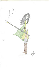 In the center there was a tall, thin girl. She seemed to be about eighteen years of age, and she wore chain mail underneath her blue dress. From the belt down, her dress was cut to look like long flower petals, overlapping each other and reaching down to just below her knees. Her golden eyes flashed mischievously as she swung her sword and a plain whip at the young man with whom she was in combat.